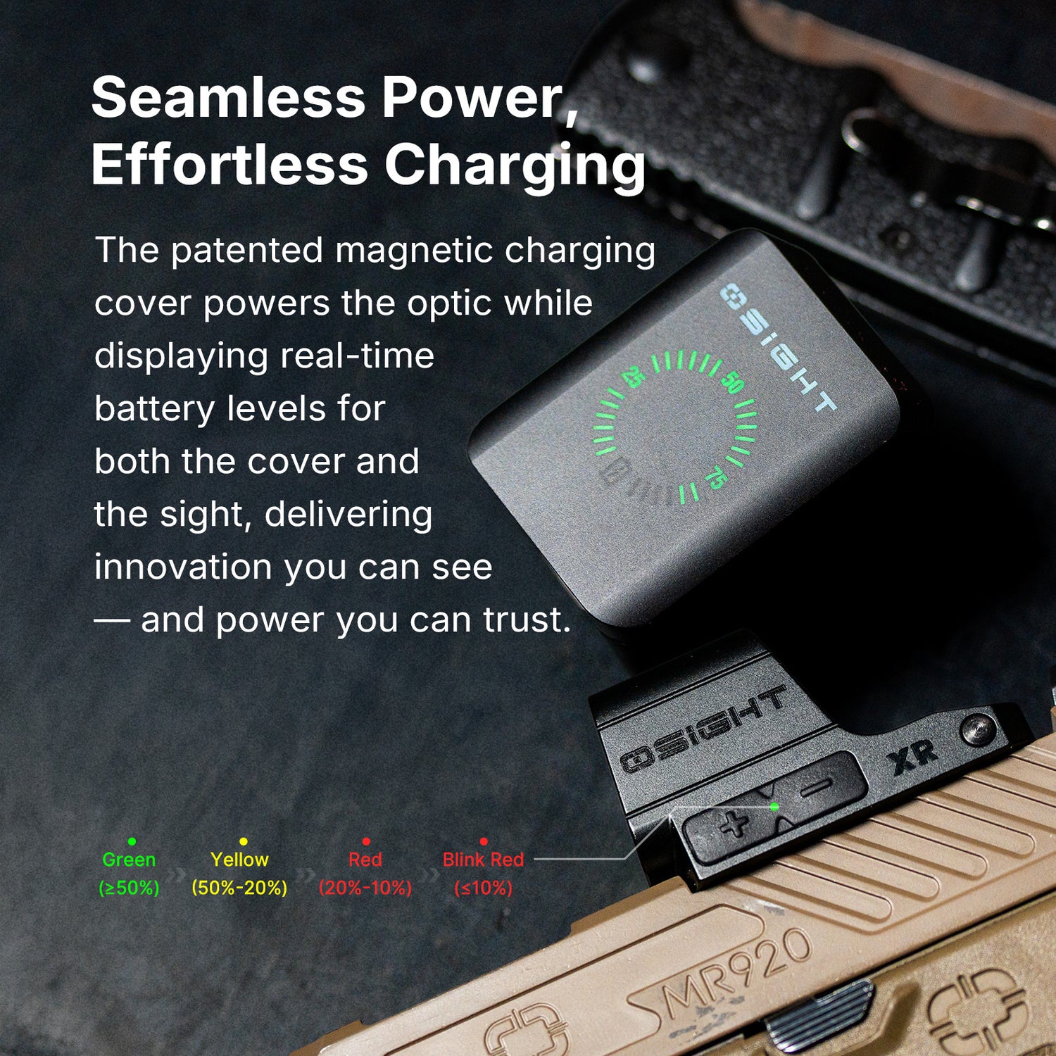 Osight XR include un capac de încărcare magnetic care face mai mult decât să protejeze optica. Încarcă colimatorul și afișează nivelul bateriei atât pentru capac, cât și pentru optică, astfel încât poți verifica rapid starea energiei fără să ghicești. Este o idee simplă, dar care face utilizarea de zi cu zi mult mai comodă.